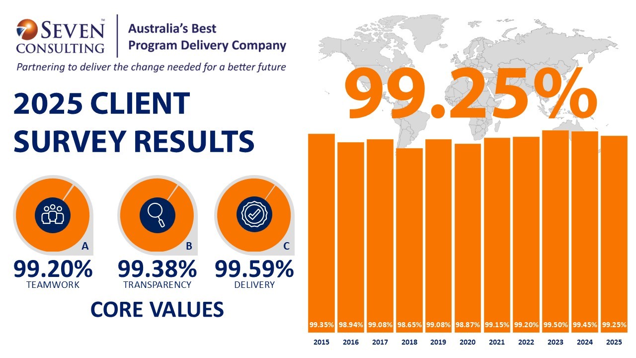 One of the tools we use to measure our success is through the completion of Customer Satisfaction surveys. We conduct these surveys on a six-monthly basis, both on the individual consultant and on how Seven Consulting is performing as a partner.